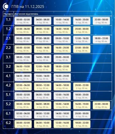 У четвер, 11 грудня, на території Сумщини застосовуватимуть графіки погодинних відключень електроенергії.