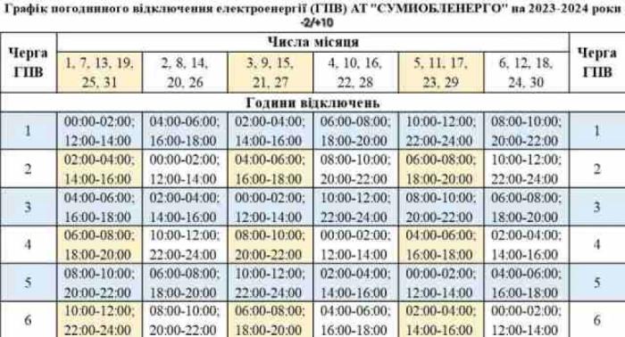 - На сайті АТ «СУМИОБЛЕНЕРГО» в розділі Споживачам-Відключення-Аварійні відключення/графіки відключень — вводимо свій особовий рахунок, дізнаємося чергу та дивимося в прикріплену табличку: https://www.soe.com.ua/spozhivacham/vidklyuchennya