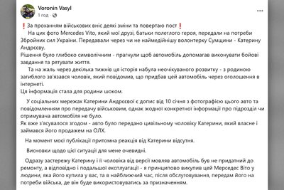 "У соціальних мережах Катерини Андрєєвої є допис від 10 січня з фотографією цього авто та повідомленням про передачу військовим, однак жодної конкретної інформації про підрозділ чи отримувача автомобіля не було. Як вже зʼясувалося згодом — авто було передано цивільному чоловіку Катерини, який власне і займався його продажем на OLX", — написав Василь Воронін.