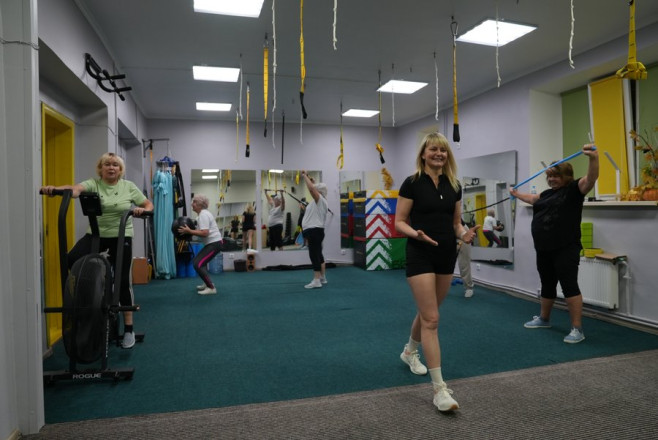 У Сумах проводять безоплатні фітнес-тренування для жінок 60+. Тренерка Світлана Глущенко організувала ці заняття після перемоги в міському конкурсі бізнес-ідей і отримання гранту на придбання обладнання.