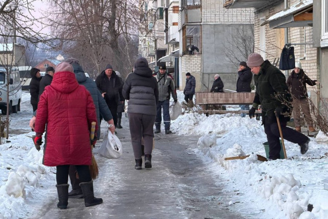 Люди прибирають наслідки російської атаки, Глухів, 20 січня 2026 року. Суспільне Суми
