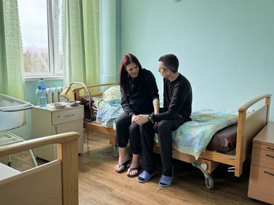 Олег і Ніна з Івано-Франківська, чоловік військовослужбовець, проходить службу на Сумщині. Жінка каже, не очікувала, що народжуватиме далеко від дому: "Я приїхала з Івано-Франківська до чоловіка, того що його забирали два місяці тому і ми не бачилися, а те, як ми день в день на протязі цілого року звикли бути разом і страх спрацював і я сіла в поїзд і просто поїхала до чоловіка. Ми планували все-таки поїхати додому і родити дома. Ну, так сталося, що ми зупинилися тут".
