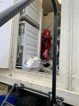 Мобільні лазне-пральні комплекси – це спеціально обладнані автомобілі з душовими, пральними та сушильними машинами, що надають доступ до гігієнічних послуг у населених пунктах, де інфраструктура пошкоджена внаслідок бойових дій. Ці комплекси забезпечують людей, які втратили доступ до води та санітарії, можливістю прийняти душ, випрати та висушити речі.
