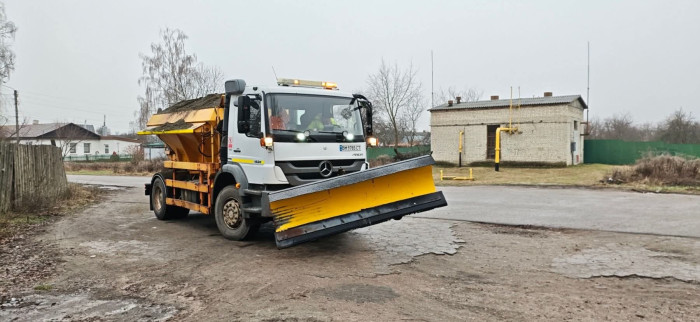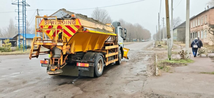 У м. Шостка дорожні служби посипають проїжджі частини протиожеледною сумішшю.