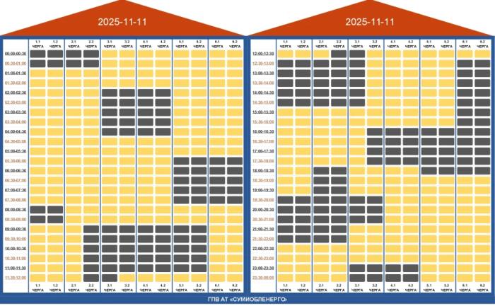 На 11 листопада 2025 року на Сумщині діятимуть графіки погодинних відключень електроенергії (ГПВ) відповідно до команди Національної енергетичної компанії «Укренерго».