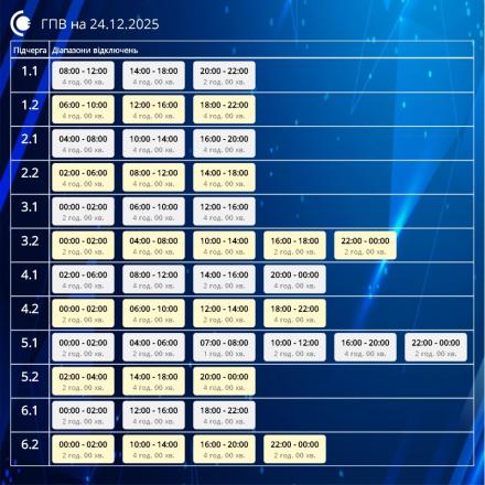 На середу, 24 грудня, НЕК «Укренерго» встановила чергові обсяги обмежень споживання електроенергії. Відповідно до цих лімітів у регіоні діятимуть графіки погодинних відключень. Енергетики наголошують, що єдиною причиною таких заходів залишається збройна агресія росії проти критичної інфраструктури нашої країни.