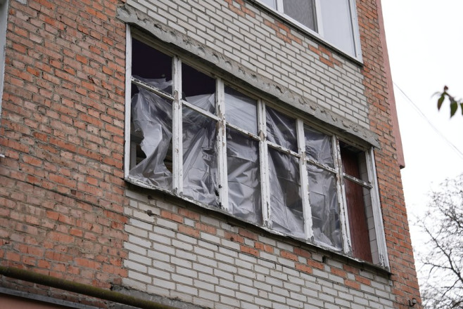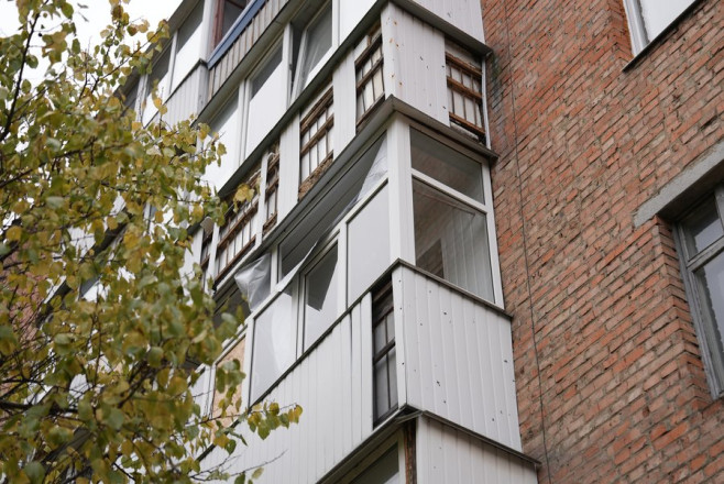 Розбиті вікна, зруйновані балкони — мешканці будинку прибирають скло після удару. Кажуть, ці руйнування їхнього будинку від вибухів — не вперше: