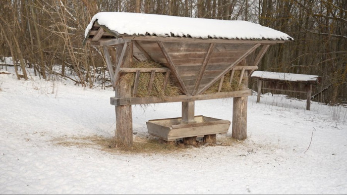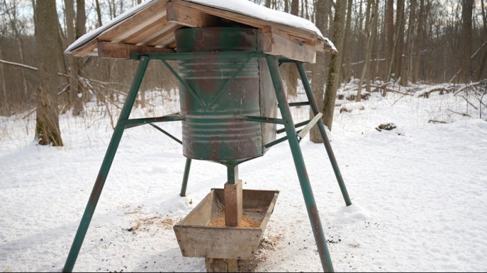 “Перевіряємо наявність корму. Якщо взяти цю годівницю, то тут 250-300 кілограмів корму. Вистачає максимум на тиждень”, – пояснює лісівник.