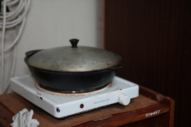 "Є у нас ось плитка, чайник, холодильник, мікрохвильова піч. Гуманітарку дають. Так що готуємо. Що не вистачає, — купуємо. Хліб, масло — продукти, які швидко псуються, купуємо", — розповідає переселенець Микола Варака.