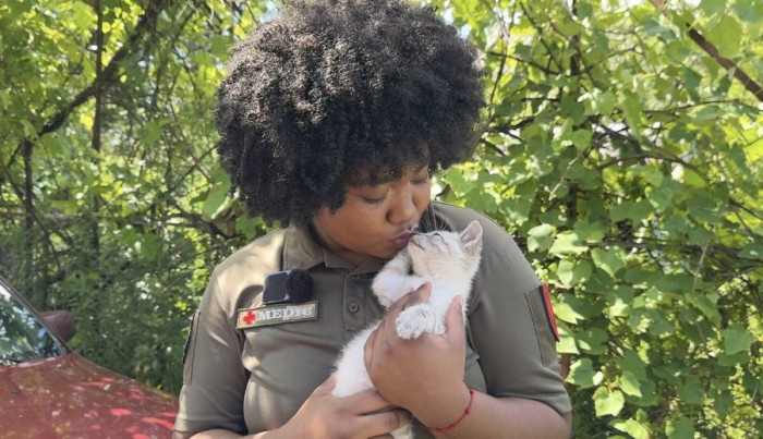 Колумбійка Нана, що воювала на боці України, тримає кошеня, яке назвала Копіто — у перекладі з іспанської це означає Сніжинка. Суспільне Суми