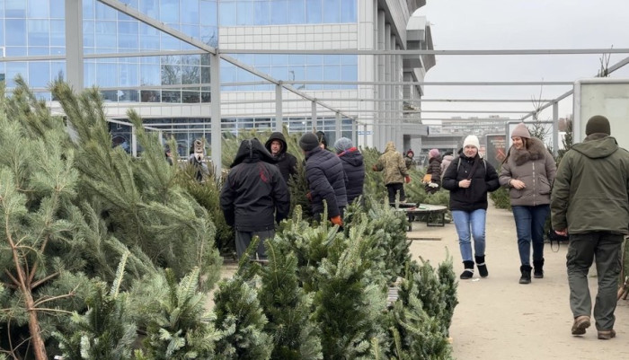 Тут також є кілька місць, де продають живі новорічні дерева. Інспектор підходить до одного з таких.