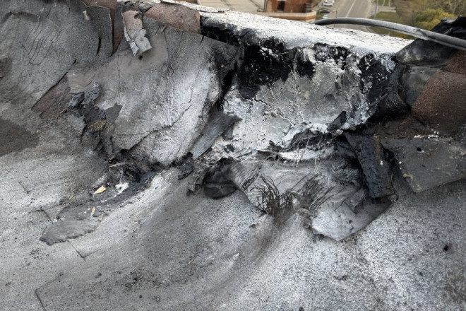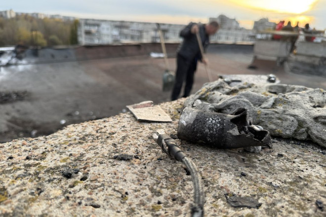 На даху багатоповерхівки ремонтники ладнали пошкоджений інтернет-кабель. Прибирав будівельне сміття поряд із місцем влучання і директор компанії-управителя, що обслуговує цей будинок Володимир Дмитрук.