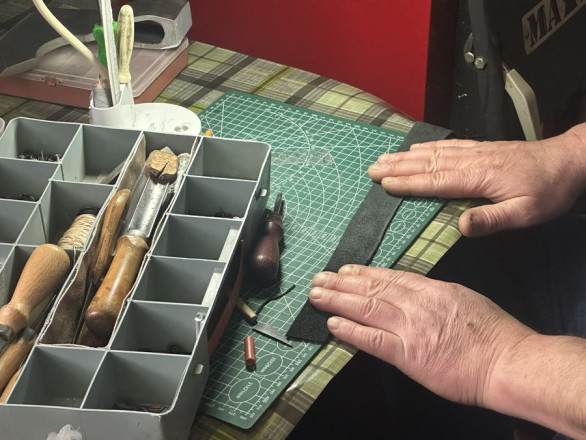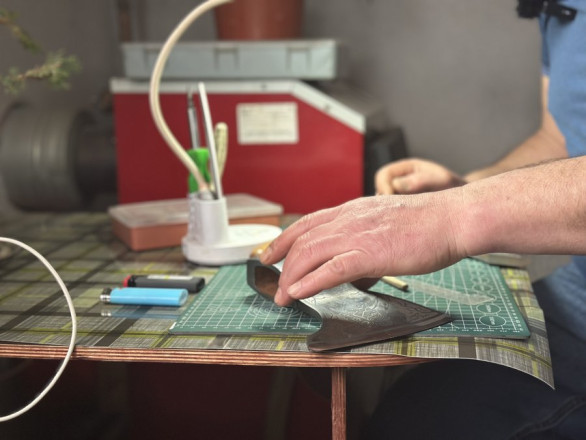 Робить майстер і оздоблення для сокир: “Замовляю в інтернеті шкіру, шию чохли, роблю обтяжку руків'я”.