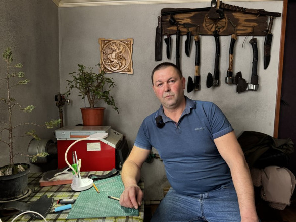 “Коли стояли блокпости я і ножі робив хлопцям. І ножни шив на ножі. І туди ж тоже хлопцям сокири як є потреба – роблю”, – каже чоловік.