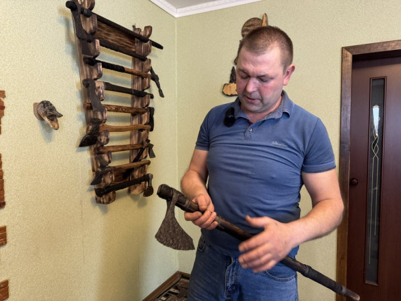 Чоловік робить різні види сокир. Наприклад, томагавки – на індіанську тематику. Пояснює, вона функціональна, але більше як сувенір. Ще є сокири на скандинавську тематику. Також майстер колекціонує та реставрує старовинну зброю.