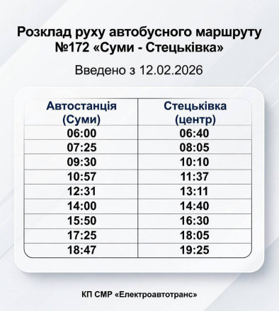 З 12 лютого почне діяти постійний розклад руху автобуса №172 "Суми – Стецьківка", який обслуговує КП "Електроавтотранс".