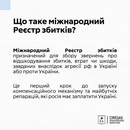 Міжнародний Реєстр збитків призначений для збору звернень про відшкодування збитків, втрат чи шкоди, завданих внаслідок агресії рф в Україні або проти України.