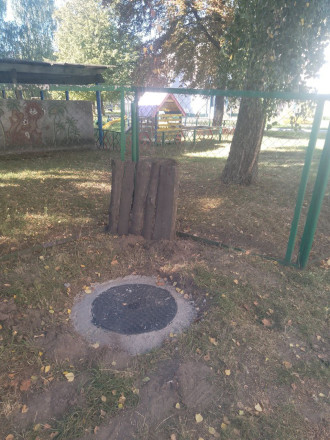 На фото: приклад відкритого колодязю з тимчасовим накриттям та приклади встановлених люків.