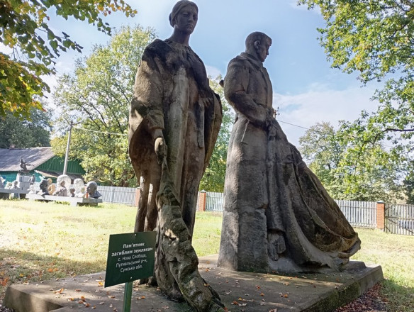 Нині в тому селі встановлений меморіал – Дзвін Скорботи. Десь в 70-х, на початку 80-х років, місцевий колгосп, який називався, до речі, дуже символічно – "Мировая революция" замовив у Харкові на художньому комбінаті цей пам'ятник, аби встановити його в центрі села. Пам'ятник скорботного типу, жертвам війни. Фігура воїна і фігура жінки. Дуже гарний пам'ятник. Його виготовили, привезли.