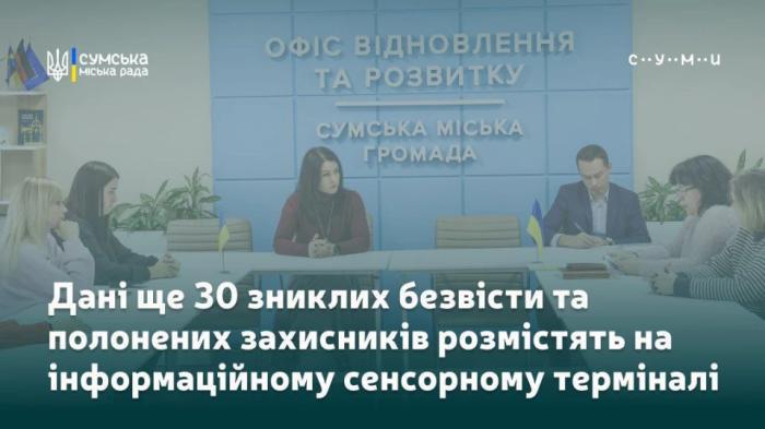 На черговому засіданні робочої групи з питань збору та відображення відомостей про жителів Сумської міської територіальної громади, які зникли безвісти або перебувають у полоні, розглянули заяви щодо 30 захисників України для розміщення на сенсорному інформаційному терміналі, встановленому на Театральній площі.