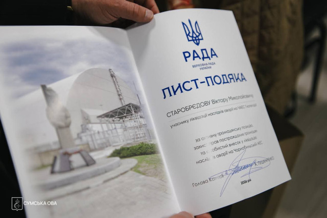 Начальник Сумської обласної військової адміністрації Олег Григоров зустрівся з жителями області, які брали участь у ліквідації наслідків аварії. Очільник області подякував ліквідаторам за мужність. Зазначив, що це був без перебільшення героїчний вчинок, адже ціною власного здоров’я вони виконували важливу місію – захищали людей і майбутнє держави.
