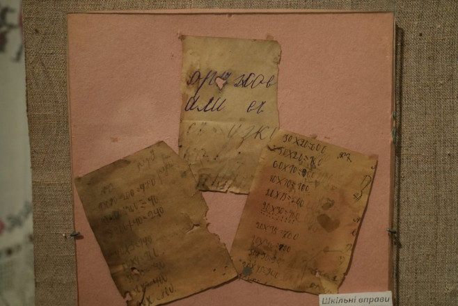 “На стенді ми бачимо шкільні вправи якогось школярика і сторінки із пісенника. Звичайні дівчата одна з одною мінялися. Такі от шкільні вправи ви можете побачити. Це є, певно, якийсь не дуже добре грамотний школярик. Тут багато помилочок. Обидва ці експонати знайдені були на горищі однієї бабусі, яка там уже і не жила. І ось оцей щоденник, де написано багато пісень різноманітних, українською, до речі, мовою. Це в ті роки, отут ви побачите 1900 рік, коли діяв Емський указ, коли не можна було нічого українською мовою, а тут ціла пісня. І ось читайте оці рядочки: “Засунусь у хаті, покутнє віконце, заховалось під вербою українське сонце. Спи, Тарасе, тихо-тихо, поки Бог розбуде, тебе славна Україна повік не забуде”, – говорить Любов.