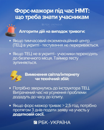Якщо учасник не зможе розпочати/завершити виконання сертифікаційної роботи під час основної сесії через форс-мажорні обставини (відключення електроенергії, повітряні тривоги понад 2,5 години), йому потрібно буде протягом трьох робочих днів з дня проведення НМТ, в якій він брав участь, подати до відповідного регіонального центру оцінювання якості освіти заяву щодо надання можливості пройти тестування під час додаткових сесій.