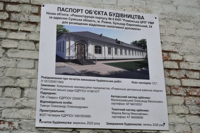 У Ромнах на Сумщині триває реконструкція корпусу центральної районної лікарні, збудованого понад сто років тому. Після завершення робіт тут планують відкрити відділення паліативної допомоги на 20 ліжок.