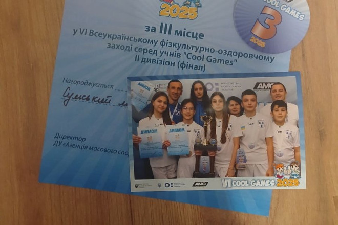 Команда сумського ліцею №33 посіла третє місце у VI Всеукраїнському фізкультурно-оздоровчому заході серед учнів Cool Games. Вони виступали у II дивізіоні – діти від 12 до 15 років і поступились лише командам з Одещини та Волині. У грі за третє місце Сумська область виграла у сусідньої Харківської посівши у підсумку третє місце за результатами змагань. Усього в змаганнях брали участь 20 команд, розповів вчитель фізичної культури ліцею №33 Леонід Сень.