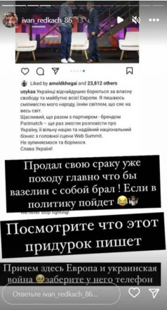 Восени 2022-го він не пройшов повз і Катерину Усик, обурившись тим, що вона через сторіс в Instagram часто згадує війну в Україні.