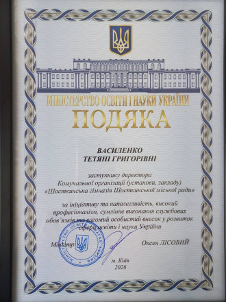 Заступниця директора Шосткинської гімназії Тетяна Василенко днями отримала Подяку від Міністерства освіти і науки України. Про це повідомили у навчальному закладі.