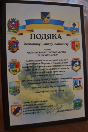 За вагомий внесок у наближення Перемоги України, всебічну допомогу Силам оборони, підтримку безпеки й життєстійкості рідного Шосткинського краю, а також за активну громадянську позицію у період повномасштабної війни керівник РВА вручив подяки голові Фермерського господарства “Талісман-агро” Дмитру Лощакову та співзасновнику ТОВ “Українська північна будівельна компанія” Денису Якименку.