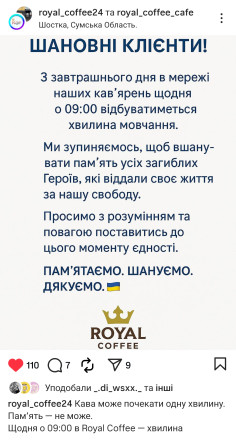 “Кава може почекати одну хвилину. Пам’ять – ні. Щодня о 9:00 в Royal Coffee – хвилина мовчання. За наших героїв, за нашу свободу”, – ідеться в дописі кав’ярні.