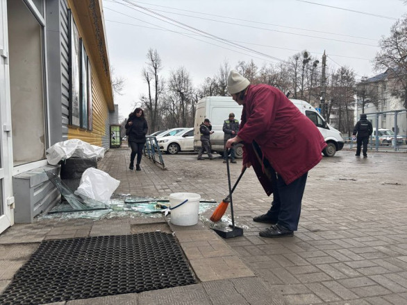 У розташованому поруч супермаркеті пошкоджений центральний вхід, прибиральниця підмітає скло. Керуючий магазином Максим розповів, що в момент удару в тамбурі був покупець.