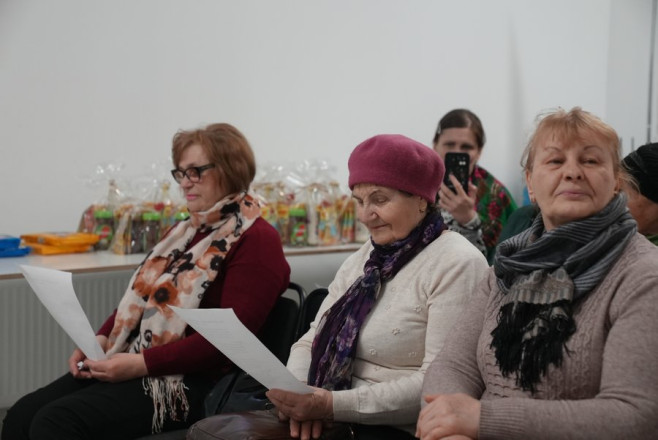Місце, де теж часто можна їх зустріти, каже подружжя, це благодійний фонд “Карітас”. На фото – літературно-музичний захід для переселенок, у якому вони взяли участь.
