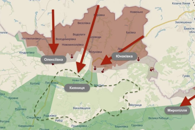 "Основним напрямком наступу залишається захоплена росіянами ділянка між селами Олексіївка — Яблунівка — Юнаківка. З цього боку росіяни мають одразу три "гілки", вздовж яких тягнуться до сіл Хотінь, Писарівка, Нова Січ. Другим, менш помітним, напрямком є Миропілля. Перенесення війни з сіл, де нині українська армія тримає оборону, у ліс означатиме суттєве ускладнення української оборони. Адже бойові дії з рівнинної місцевості перейдуть у густий ліс з глибокими ярами", — йдеться у матеріалі.