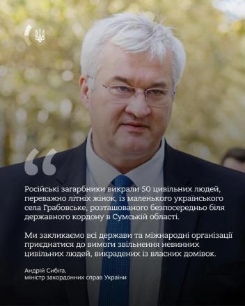 Міністр закордонних справ України Андрій Сибіга зробив офіційну заяву щодо депортації мешканців прикордонного села Грабовське, що на Сумщині. Він порівняв методи окупантів із тактикою найвідоміших терористичних угруповань світу.