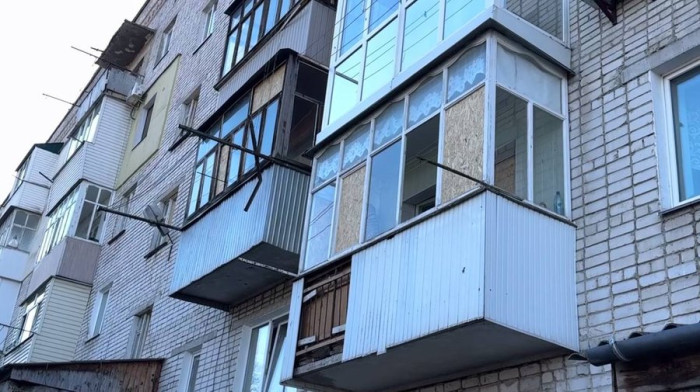 Мешканці пошкоджених багатоповерхівок прибирають вибите скло та лагодять понівечені рами.