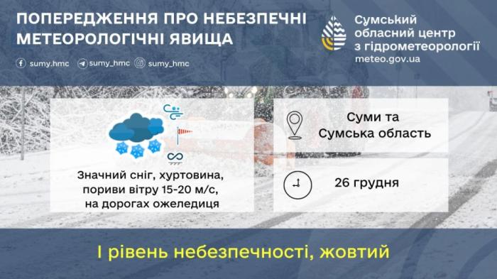 Як повідомили в обласному гідрометцентрі, вночі та вранці 26 грудня по Сумській області та в місті Суми очікується значний сніг. Протягом усієї доби прогнозують пориви західного вітру зі швидкістю 15-20 м/с та хуртовини. Через такі метеорологічні явища на дорогах утвориться ожеледиця.