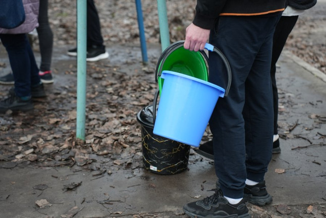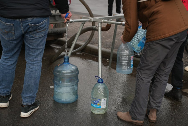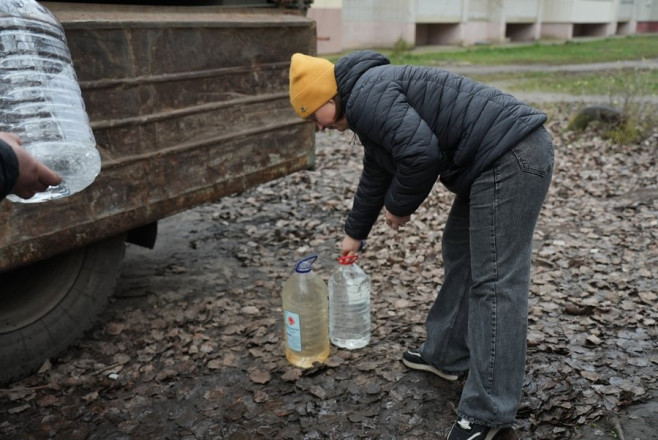 Зранку 18 листопада люди із порожніми пляшками та відрами під звуки роботи ППО, гудіння безпілотників та вибухами чекають, аби набрати води.