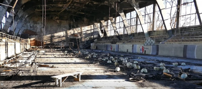 Після вчорашнього ворожого удару по спорткомплексу, сьогодні організована робота із закриття контуру приміщення.