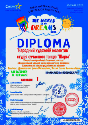 Вихованці Народного художнього колективу — студії сучасного танцю «Шарм» Шосткинського Центру естетичного виховання вибороли перше місце у Міжнародному дитячому фестивалі талантів «Світ моєї мрії – 2026».