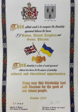 Міста Суми (Україна) та Болтон (Велика Британія) офіційно закріпили свої дружні відносини, обмінявшись підписаними сувоями «Листи дружби».