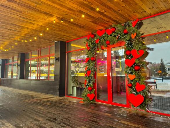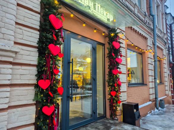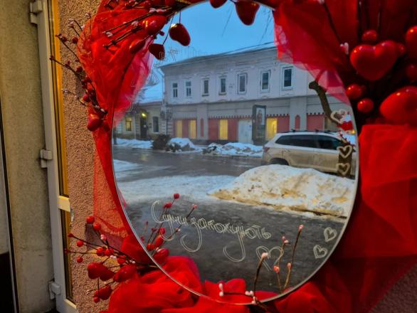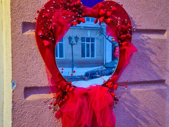 На вітринах магазинів і кав’ярень з’явилися серця, червоні стрічки й банти, а також написи «love». Деякі заклади дали друге життя новорічному гіллю хвої — тепер його прикрашають червоні серця.