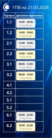 У суботу, 21 березня, на території Сумської області продовжуватимуть діяти графіки погодинних відключень електроенергії.