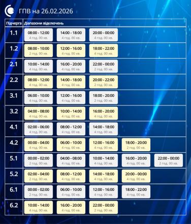У четвер, 26 лютого, на території Сумської області продовжуватимуть діяти графіки погодинних відключень електроенергії.