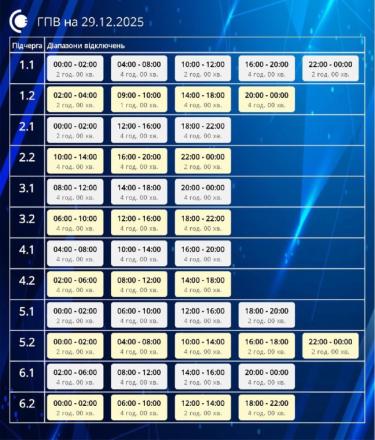 У понеділок, 29 грудня, на території Сумської області продовжуватимуть діяти графіки погодинних відключень електроенергії.