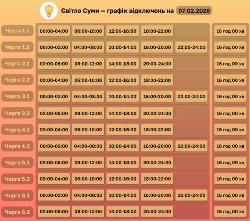 У суботу, 7 лютого, на території Сумської області продовжуватимуть діяти графіки погодинних відключень електроенергії.