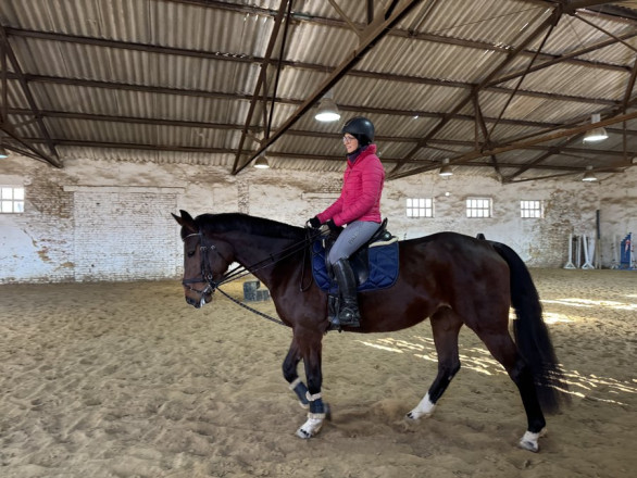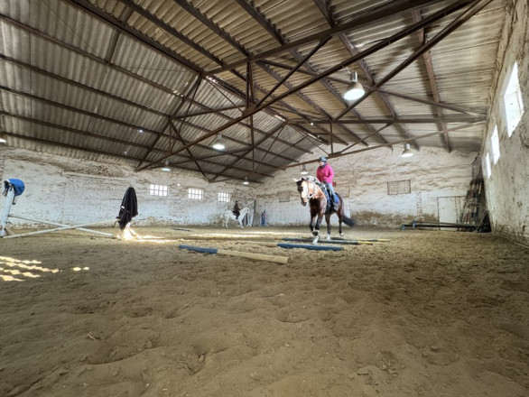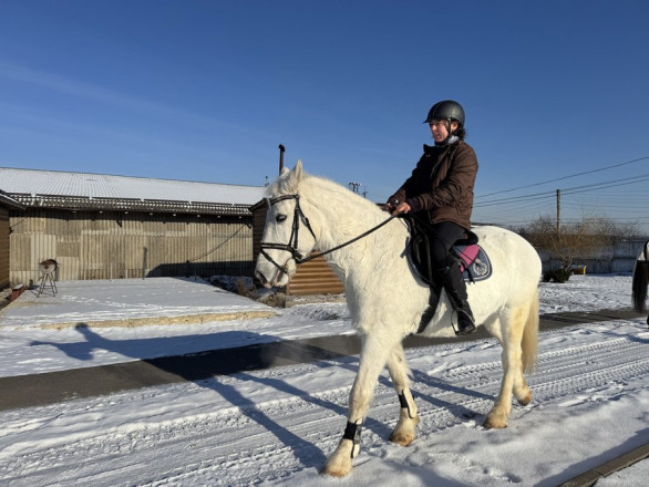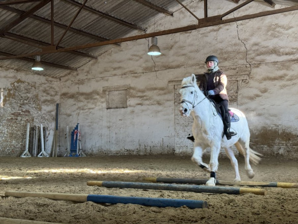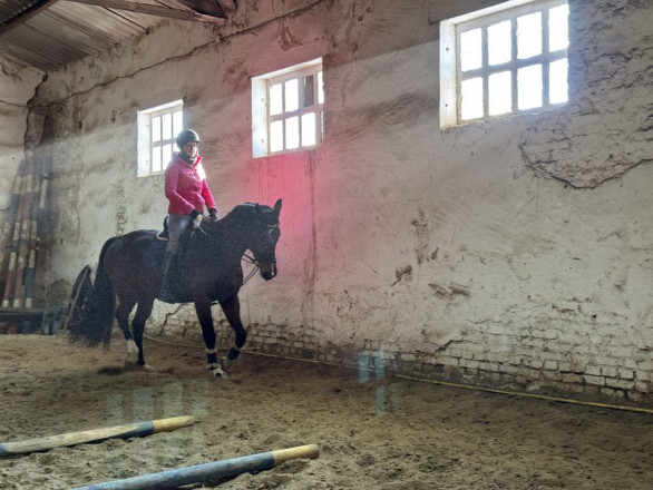Ольга Віршич займається кінним спортом близько восьми років. Цього разу вона тренується на кобилі Колісті у критому манежі.