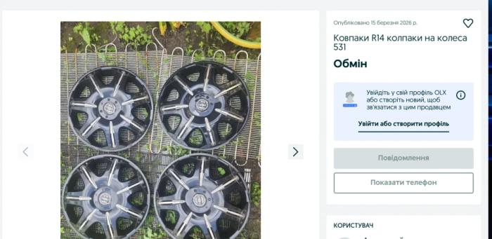 Трапляються й пропозиції обміну автомобільних аксесуарів. Наприклад, ковпаки на колеса R14 пропонують обміняти на інші товари за домовленістю.